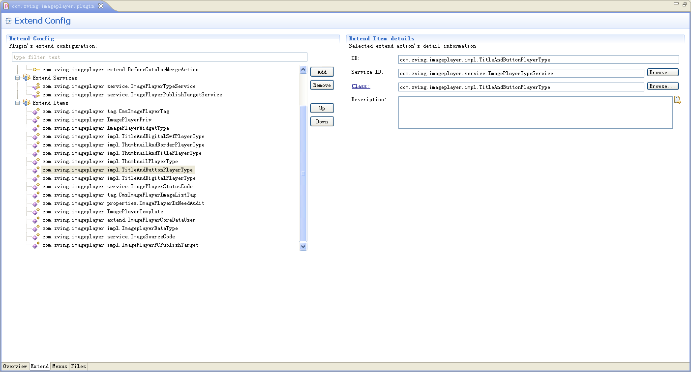 // 获取播放器模板文件地址 public abstract String getTemplateFileName(); // 获取播放器Code public abstract String getImageTypeCode(); // 获取播放器的名称 public abstract String getImageTypeName(); // 获取图片播放器效果预览图片名称 public abstract String getPreviewImageName(); // 获取播放器使用的js文件名称 public abstract String getJsName(); //必须要拷贝到站点目录下的文件 public abstract List<String> getNeedFiles(); |