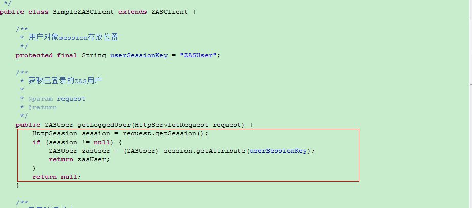 需要进行登录操作前ZASClient首先调用getLoggdeUser方法从指定的session中获取ZAUser对象若ZAUser对象存在,则应用已经登录,不再进行再次登录操作,如果不存在则进行登录操作。
