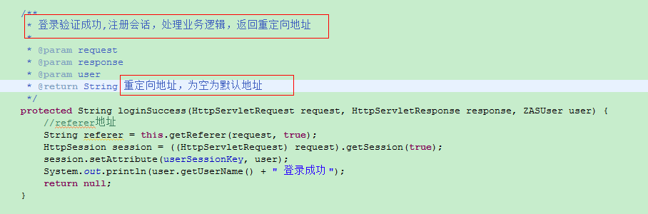 protected String loginSuccess(HttpServletRequest request, HttpServletResponse response, ZASUser user){}