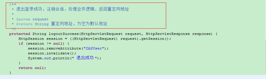 用户在zas中退出后,zas发送请求统一将所有应用退出,应用调用logoutSuccess方法。在此方法中将该用户的会话注销,处理必要的业务逻辑,返回重定向地址。返回值为null,为默认地址。