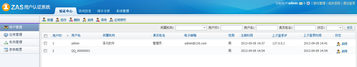 可以通过功能按钮进行新建、修改、删除、启用、停用、应用授权、查询用户等操作。