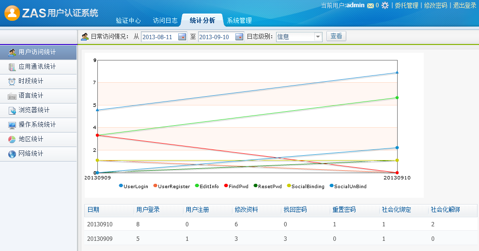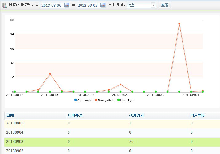 提供用户对门户系统访问的统计结果汇总并分析。管理员可以对所有访问门户系统的用户进行统计和分析,针对访问量、异常情况、地区分类、操作系统类型、浏览器类型等统计类别进行详细统计,统计图以饼状和柱状图的形式展现。
