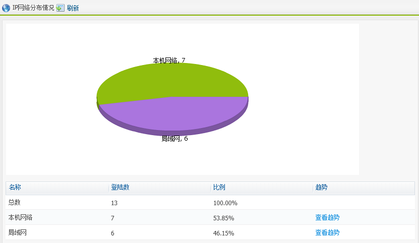 统计用户使用不同网络访问本网站的饼图与统计列表。
