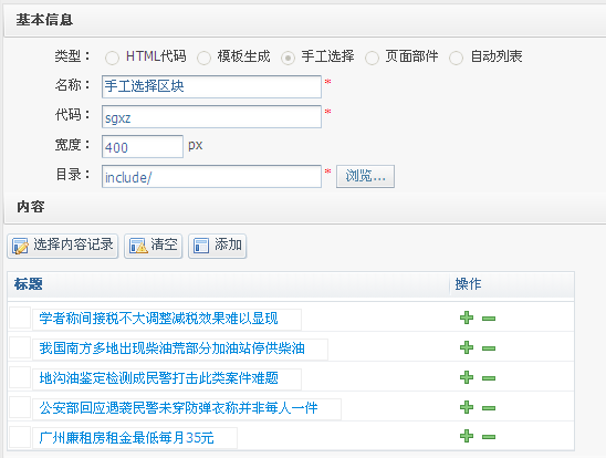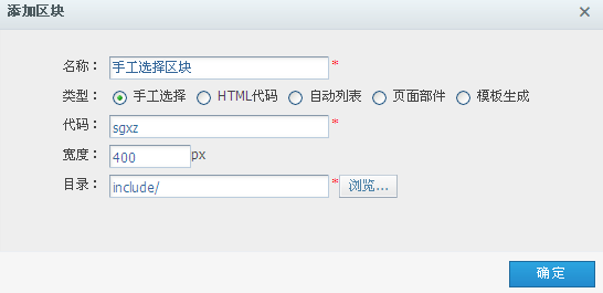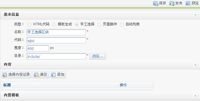 区块类型有:手工选择、HTML代码、自动列表、页面部件、模板生成五种。下面我们以“手工选择”类型的区块为例,详细介绍如何新建、编辑、删除区块。