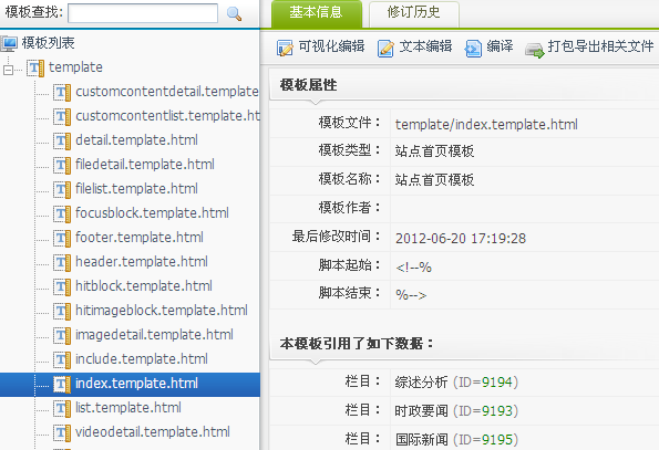 编辑模板有两种方式:可视化编辑和文本编辑。下面以index模板为例具体介绍两种编辑方式。