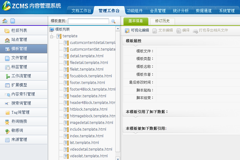 打开“模板管理”菜单,界面如下所示,列表区中为本站点下用到的所有模板,