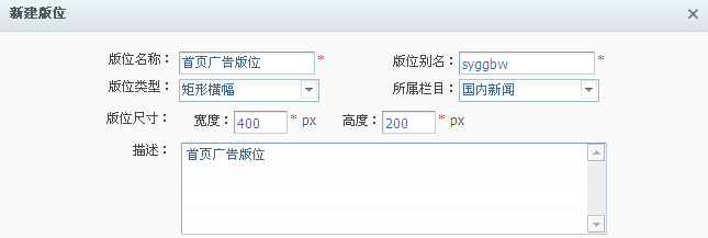 勾选该广告版位前的复选框,再点击右侧广告显示区的“新建广告”按钮,弹出新建广告对话框,填写信息如下: