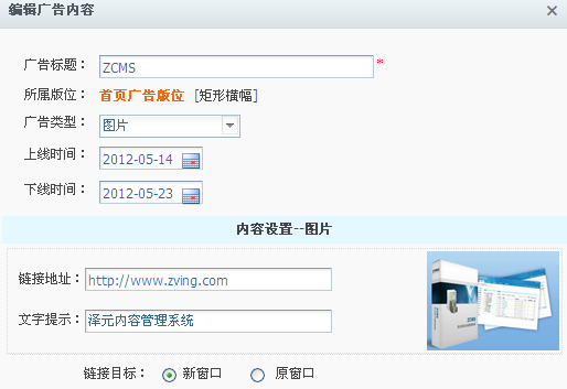 编辑广告:广告显示区,选择“ZCMS”记录,点击“编辑”按钮或者双击,弹出编辑对框。