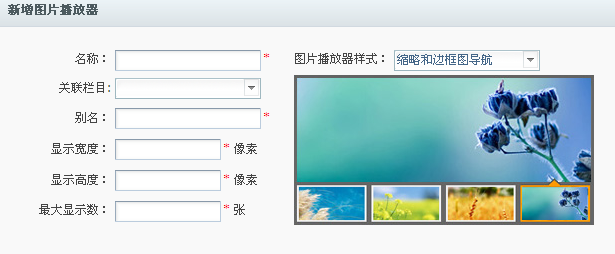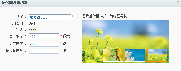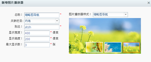 下面以“缩略图导航”样式的播放器为例,填写信息如下,点击“确定”按钮,生成新的图片播放器。