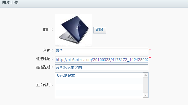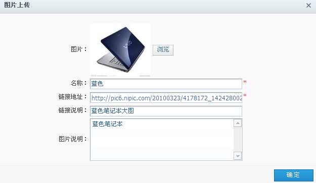 图片显示区,选择“蓝色笔记本“记录后,点击“编辑”按钮或者双击,弹出如下对话框,修改图片信息或者重新上传其它图片后,点击“确定”按钮,修改被保存。
