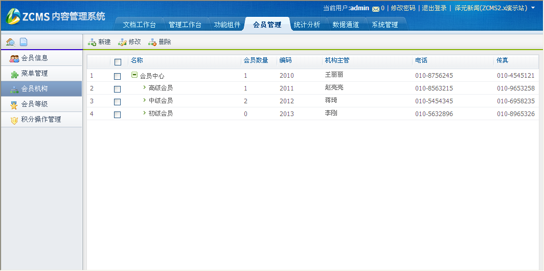 点击“会员机构”菜单打开如下界面。会员信息中的所属机构列表中的内容就是由会员机构来管理的。