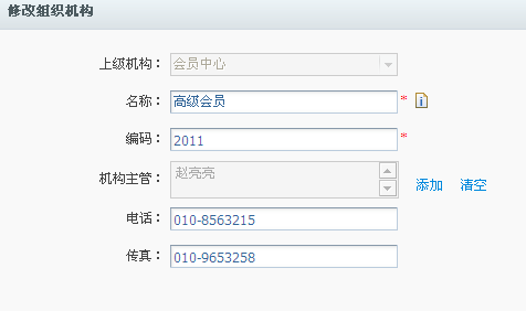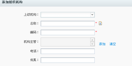 机构主管:可以通过“添加”按钮添加机构主管,也可以通过“清空”按钮,清空该字段内容。
