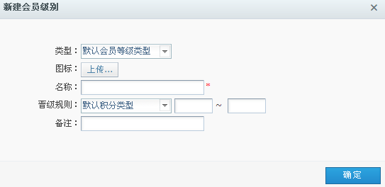 当该系统中有多种积分规则时,选择对应的会员类型和晋级规则后,填写该级别的积分段、名称、备注等信息,点击“确定”按钮,新建功能完成。