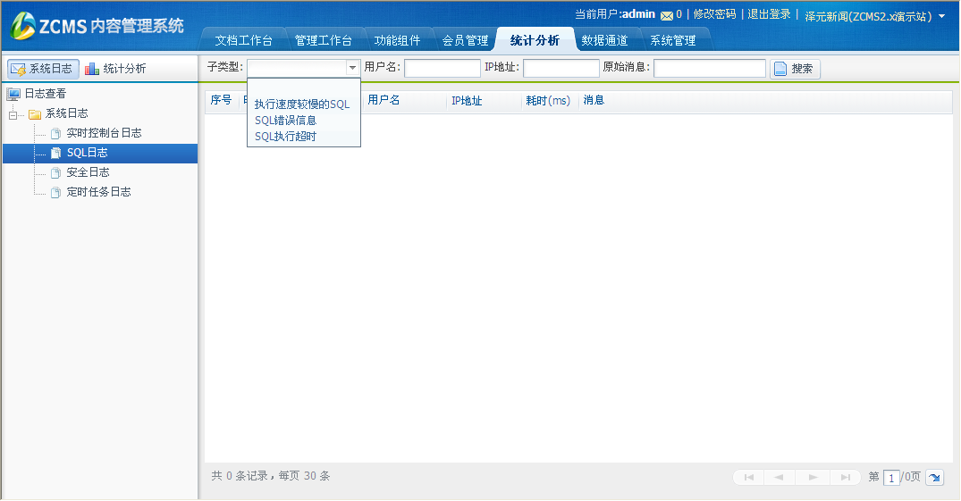 界面显示如下,此页面显示的是SQL日志。在此页面可以根据各种查询条件来查询要看的日志记录。