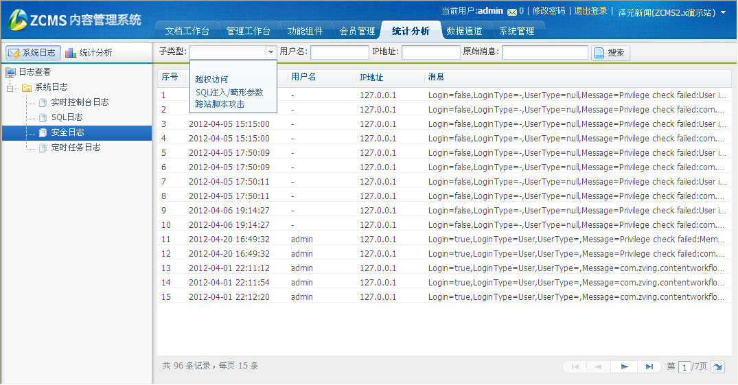 界面显示如下,此页面显示的是安全日志,可以通过各种查询条件,搜索想要查看的日志记录。
