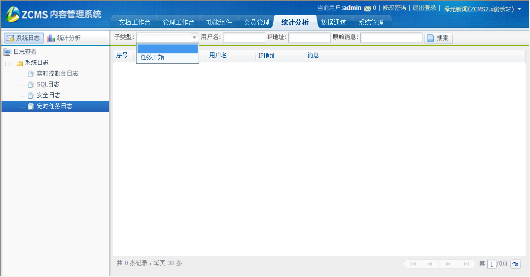 界面显示如下,此页面显示的定时任务日志,根据各种查询条件可搜索想要查看的日志记录。