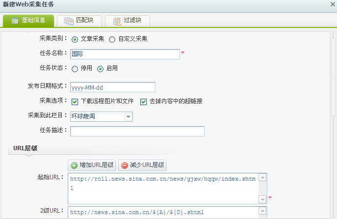 按钮,出现2级URL, 在这里一般填写目标栏目的新闻页面的URL地址,上图中使用了${A}和${D}来匹配符合某种形式的新闻页面名称。