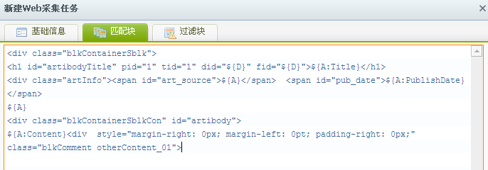 在目标新闻页面中,新闻标题和新闻正文通常都被一个HTML标签,或一段固定的HTML代码所包围,按照这个规律填写匹配块的内容,系统就能解析出我们想要的新闻标题和新闻正文。