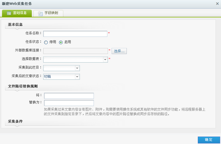 点击数据采集任务列表上方的“新建”按钮,打开如下对话框,填写信息后,点击“确定”按钮,新建操作完成。