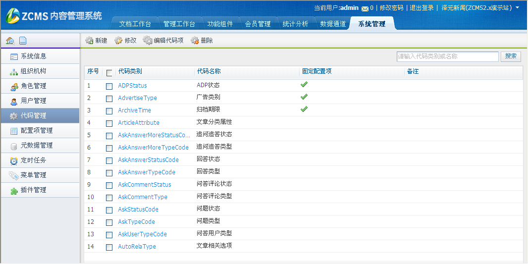 在代码管理中,用户可以根据自己的需要自定义代码,动态地管理系统中的下拉列表、单选按钮组、复选框组中的数据,以满足不同系统的需要和不同的定制化功能,界面如下图所示: