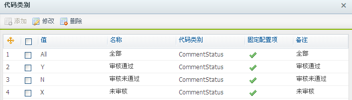 选择代码名称为“评论状态”的记录,点击按钮,打开如下对话框,通过对其中的代码子项的“添加”“修改”“删除”等操作,确定代码子项与后台代码的对应关系,从而实现代码定制化功能。