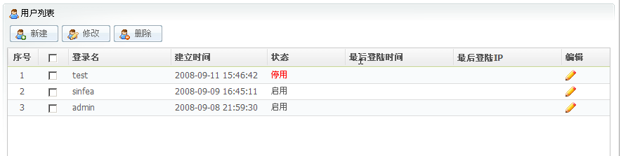 高级管理员支持修改用户的信息(基础信息或密码),暂停用户登录。注册用户以列表的形式显示在用户管理里,超级管理员可新建、删除、修改用户,系统后台提供多种方式的用户查询,可按注册时间、用户名、电子邮件地址等进行用户查询。