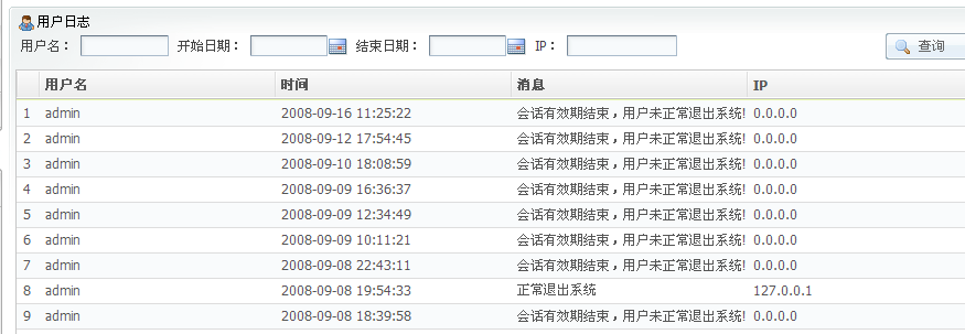 系统记录用户登录情况,显示用户登录、退出登录时间、IP地址。