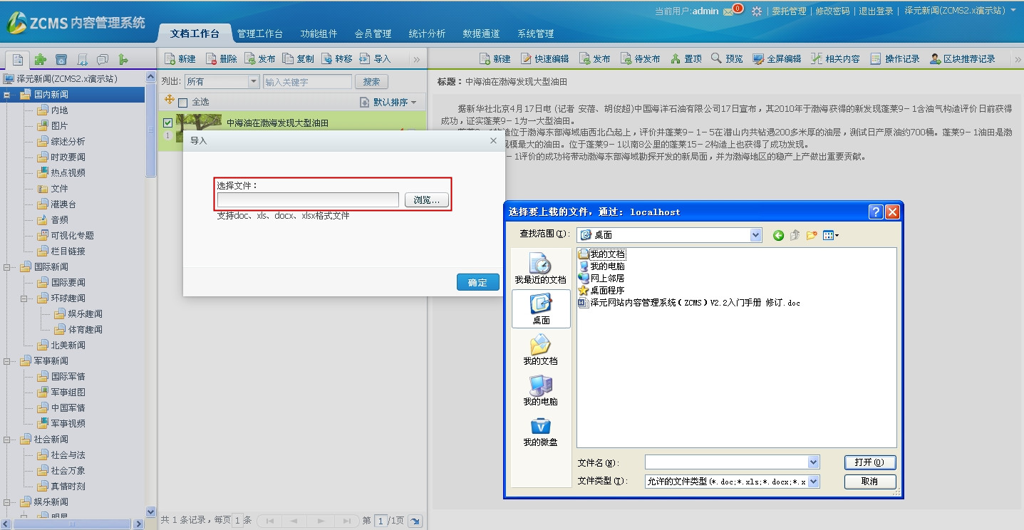 @Priv(CatalogPrivService.ContentPrefix + "Add.${CatalogID}") public void wordImport(UploadAction ua) { if (ua.getAllFiles() == null || ObjectUtil.empty($V("CatalogID"))) { fail(Lang.get("Article.UploadFile.MissMsg")); return; } String dirPath = SiteUtil.getSiteRoot(SiteBL.getCurrentSite()) + "upload/_wordimport/"; for (FileItem fi : ua.getAllFiles()) { try { String title = fi.getName().substring(0, fi.getName().lastIndexOf(".")); int count = ArticleBL.sameTitleCount(title, $V("CatalogID"), SiteBL.getCurrentSite(), "0"); if (count > 0) { fail(Lang.get("Article.TitleExists")); return; } if (!new File(dirPath).exists()) { FileUtil.mkdir(dirPath); } File in = new File(dirPath + fi.getName()); fi.write(in); …… // 保存文章 Mapx<String, Object> params = new Mapx<String, Object>(); params.put("CatalogID", $V("CatalogID")); params.put(ArticleContent.ContentsKey, content); params.put("Title", title); params.put("ID", NoUtil.getMaxID(IContent.CONTENT_PRI_KEY)); ArticleContent article = new ArticleContent(params); article.setTransaction(Current.getTransaction()); article.setValue(ArticleContent.Operator, User.getUserName()); article.insert(); ContentLogBL.log(article, ContentLogType.ADD, Lang.get("Contentcore.Import"));// 增加日志记录 } catch (Exception e) { e.printStackTrace(); fail(e.getMessage()); FileUtil.deleteFromDir(dirPath); return; } finally { FileUtil.deleteFromDir(dirPath); } } if (Current.getTransaction().commit()) { success(Lang.get("Common.ExecuteSuccess")); } else { fail(Lang.get("Common.ExecuteFailed")); } } |