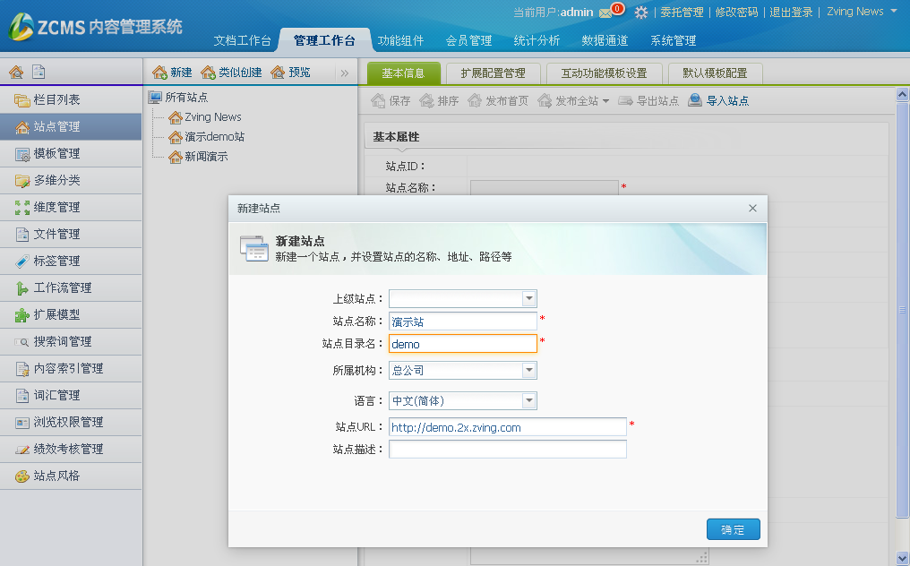 切换到【管理工作台】下的【站点管理】菜单,点击列表区的“新建”按钮,在打开的对话框中填写站点名称、站点目录、站点URL等信息,点击“确定”按钮,该站点即新建完成。