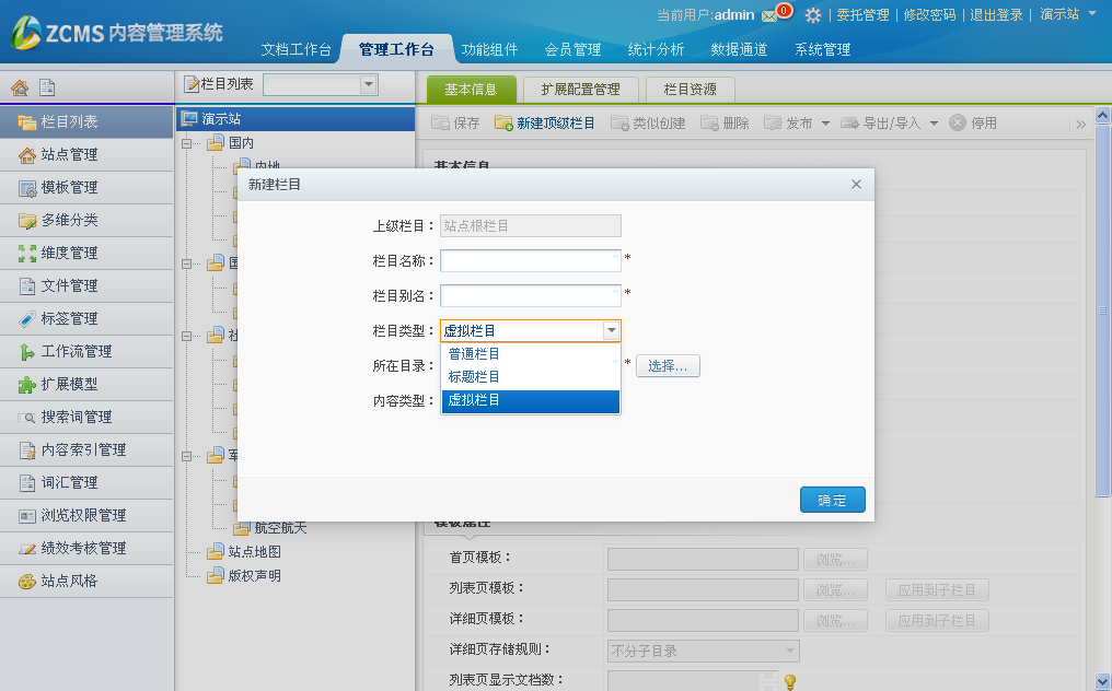 注意:如果需要添加标题栏目或者虚拟栏目,可以通过“新建顶级栏目”或“新建子栏目”功能中选择栏目类型来添加。