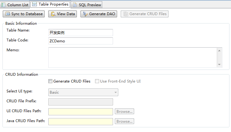 4) Generate CRUD Files生成当前表的增删改查文件,通常我们这个按钮默认是不可用的,因为如果我们需要让工具自动生成表数据的赠删改查还需要作更进一步的配置,当我们勾选了Generate CRUD Files时,这个按钮会变得可用。