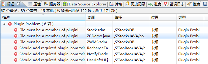 做完前面的工作,我们会看到这个文件上有错误,但是这并不说明生成的DAO类有问题,使用eclipse的“标记”窗口,我们可以看到我们项目所发生的问题。于是我们打开“标记”窗口。