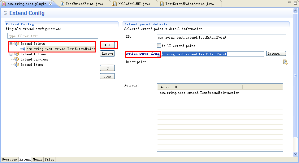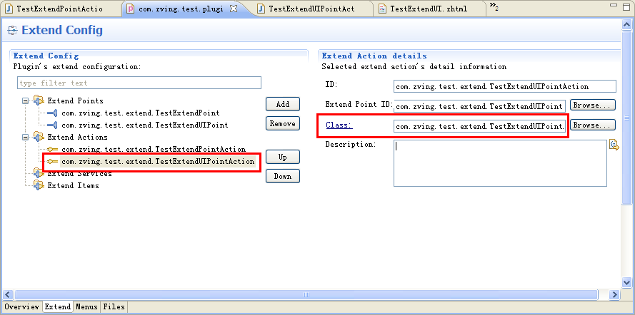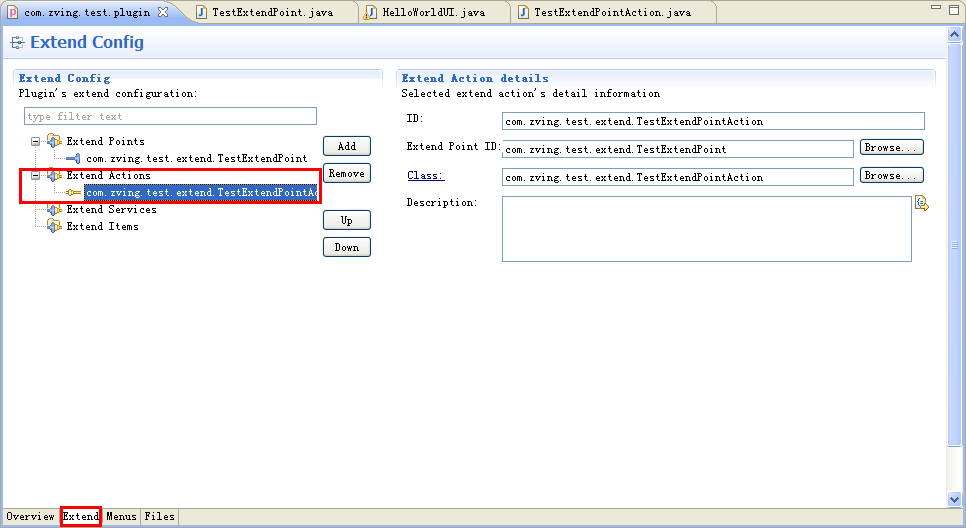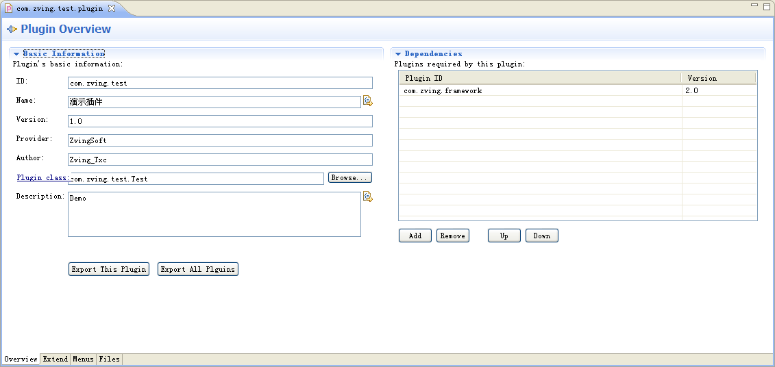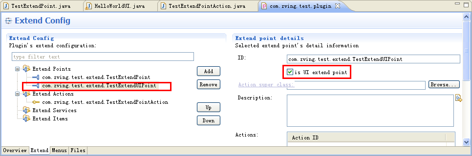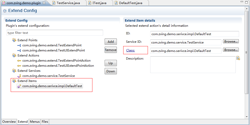 请注意,插件的配置项ID:com.zving.test.extend.TestExtendPoint一般都和类的包路径保持一致。