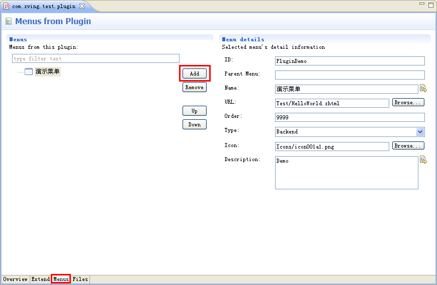 打开Eclipse插件的配置文件界面,选中左下角的menu菜单,点击menu菜单页面的add按钮,添加一个插件菜单,并且填写相关信息,如下图: