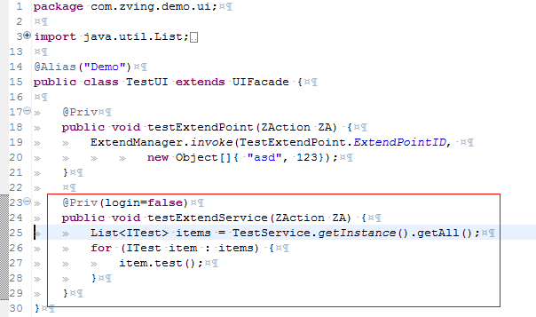 扩展点添加后,可以在需要扩展的类中添加此扩展点,以HelloWorld.java为例添加扩展点如下: