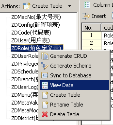 数据表树显示当前分类中的数据表,可以以右键点击的方式弹出右键菜单,进行相关操作,如下图所示: