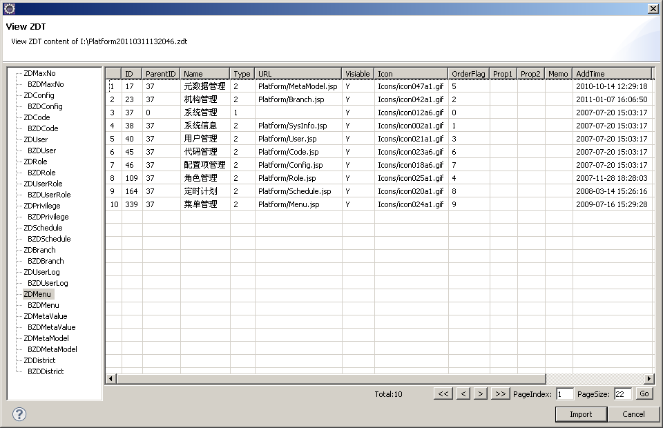 选中要导出的表后,点“Export Data File”将导出一份含有所有表中数据的.zdt文件。点“Export DLL SQL”将导出一份建表SQL文件,点“Import Data File”将弹出文件选择框让用户选择要导入的.zdt文件,选择后会出现查看.zdt文件的界面,用户确认.zdt文件中的表和数据后点“Import”即可开始导入。查看.zdt文件的界面如下图所示: