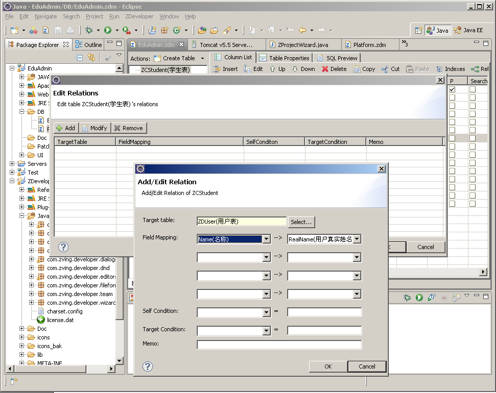 ZDeveloper也可以管理表和表之间字段的对应关系,在“Column List”界面点击“Relations”按钮,弹出关系管理界面,如下图所示: