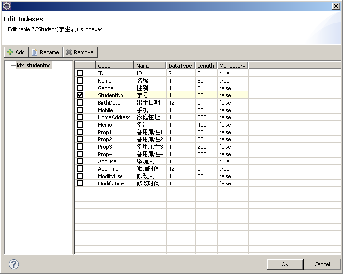 在此界面可以添加、重命名和删除索引,通过直接在右侧表格中选中相应的行即可设定索引包含的字段。