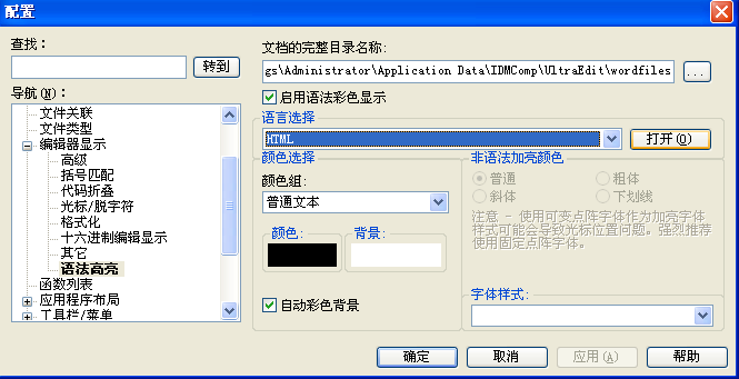 2)在打开的配置窗口中选中左侧导航栏中的语法高亮,在右侧的文档的文章目录名称中选择UE编辑器安装目录下的wordfiles,在语言选择列表中选中HTML,点击打开按钮;