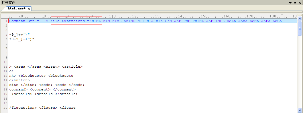 3)在打开的html.uew文件第一行的File Extensions后面增加ZHTML后缀;