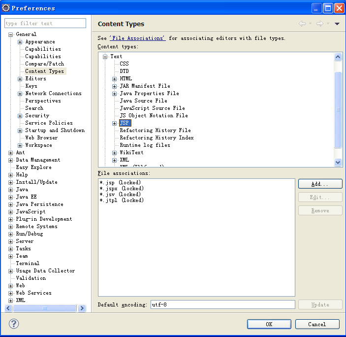 2)展开General,点击Content Types ,在右侧的Content types框中选中JSP;