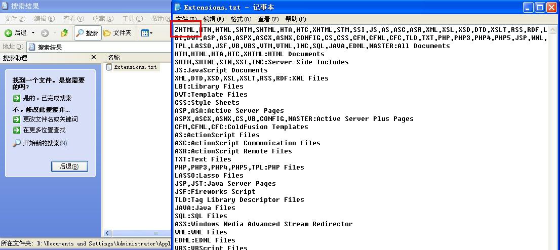 2)在搜索到的Extensions.txt文件的第一行添加 “ZHTML,”。