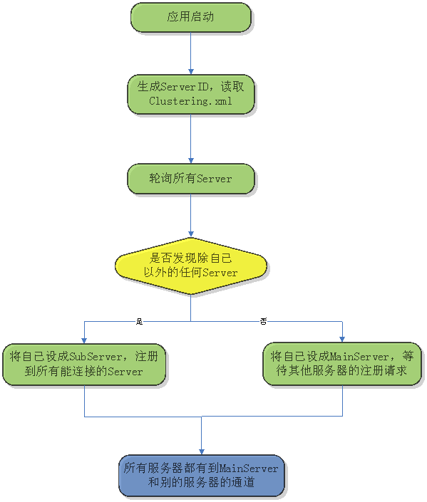 4)服务器A逐个尝试与其他服务器建立连接,如果没有任何服务器有响应,则将自己标识为MainServer;