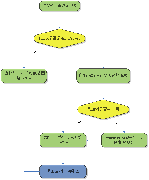 2)如果服务器A是MainServer,则锁S的值通过synchronized块加一,并将加一后的值返回给A,流程结束;