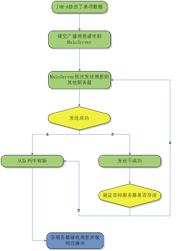 假设有JVM-A,JVM-B、JVM-C、JVM-D构成的一个集群,启动时确立JVM-A为MainServer、JVM-B为BackupServer,则集群中任何获取一般锁和累加锁的操作都会导致JVM-A向JVM-B发送备份请求,备份请求通过单独的线程发送,不阻塞当前操作。某个JVM发送消息的操作会先向JVM-A提交,再由JVM-A逐个发送消息,每发送完一台服务器,则会将发送队列备份到JVM-B。
