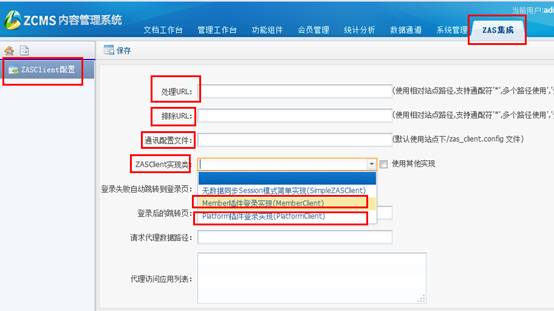ZASClient实现类:这个地方有3个可选,一般我们选取第2个和第3个。当我们集成的用户为ZCMS前台会员用户时,使用第2个Member插件登录实现;当我们集成的用户为ZCMS后台管理员用户时,使用第3个 Platform插件登录实现;第一种:无数据同步则只是简单建立SESSION,ZCMS系统不会有当前用户的信息,这种情况,只有在非常特殊,需求非常简单的场景下才会用到。