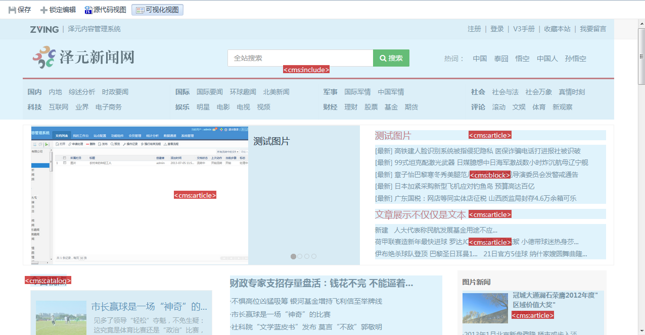 ZCMS提供了多种基于WEB的模板制作方式,包括在线语法加亮和模板标签加亮的源代码编辑模式,以及基于标签树的属性表单编辑模式,还有所见即所得 的可视化编辑模式。可视化模板编辑时,ZCMS能够自动识别各个模板标签并以所见即所得的方式显示,用户可以直接点击相应的标签区域,即可在弹出的窗口中 修改标签相关的属性。