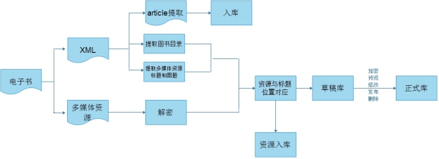 系统支持对XML、PDF、Excel、Word、Txt、Epub、图片、图表、音视频、图书、期刊等在内的多种资源格式的入库管理,其中对于图书、期刊这种资源类型的文件入库后,系统将自动提取文件中的目录结构,自动记录图片、图表、PDF、WORD、EXCEL、HTML等资源与图书、文献之间的关联。并根据最小的目录单元对文件自动碎片化。用户也可以根据实际需要,对目录结构和碎片化资源进行拆分和重组。