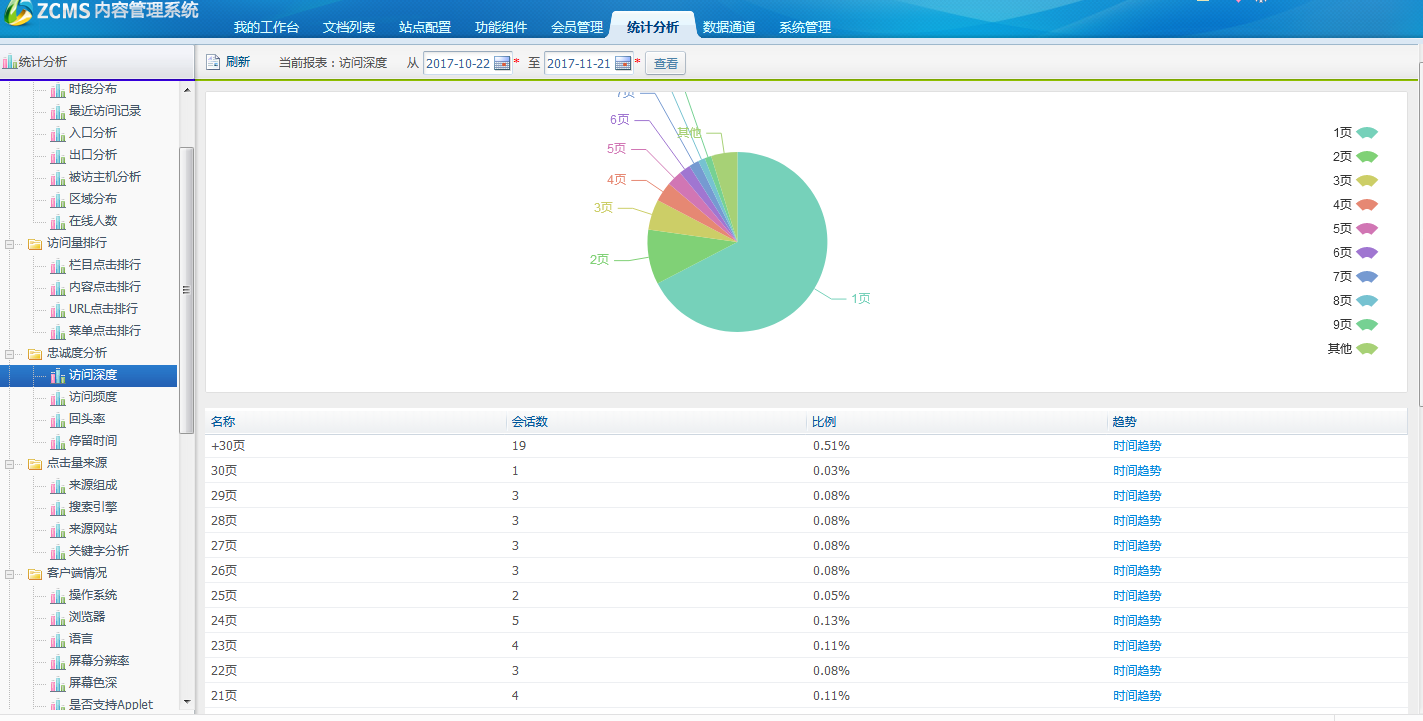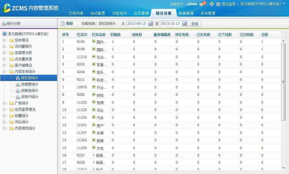 ZCMS内置的访问统计不仅能够统计整体访问情况,还能够逐级统计各栏目的访问情况,并能够统计不同的内容类型的访问情况。ZCMS还内置了发布统计功能,能够按部门、栏目、用户分别统计编辑、审核、发布等各个环节的工作量。